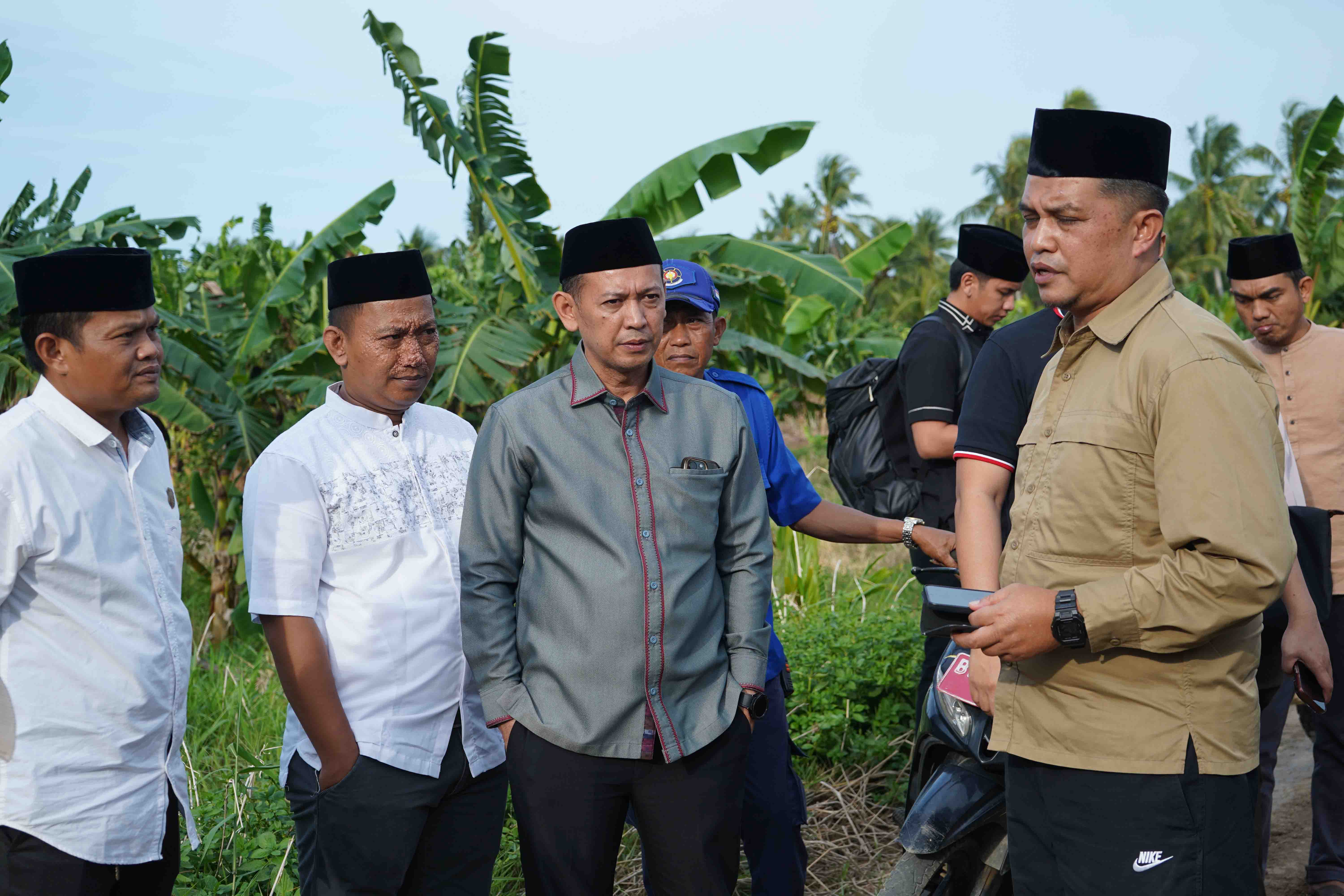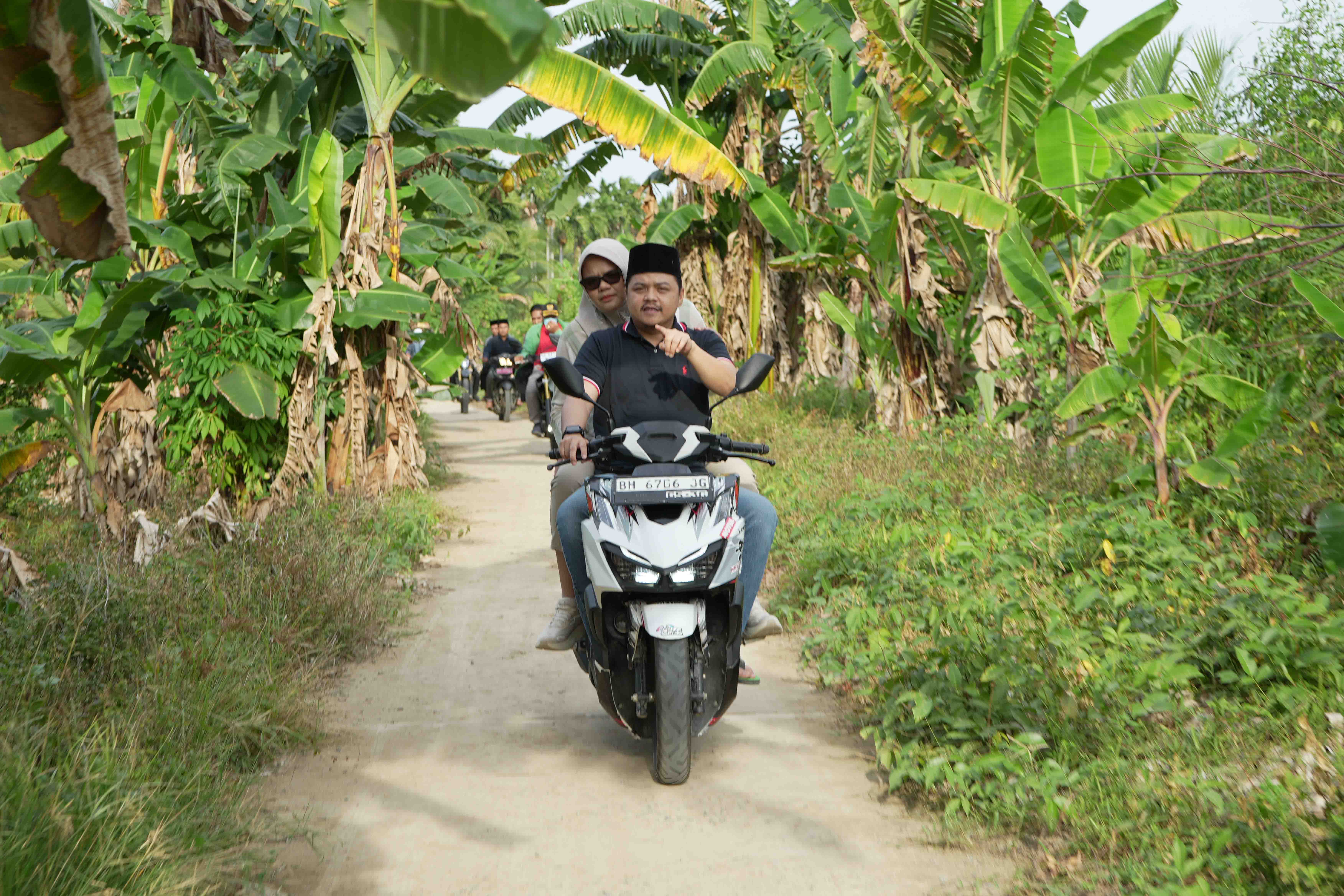 Rombongan meninjau kondisi jalan yang menjadi akses utama masyarakat dalam mengangkut hasil pertanian dan perkebunan. Jalan tersebut memiliki peran strategis dalam mendukung aktivitas perekonomian warga di kedua desa.